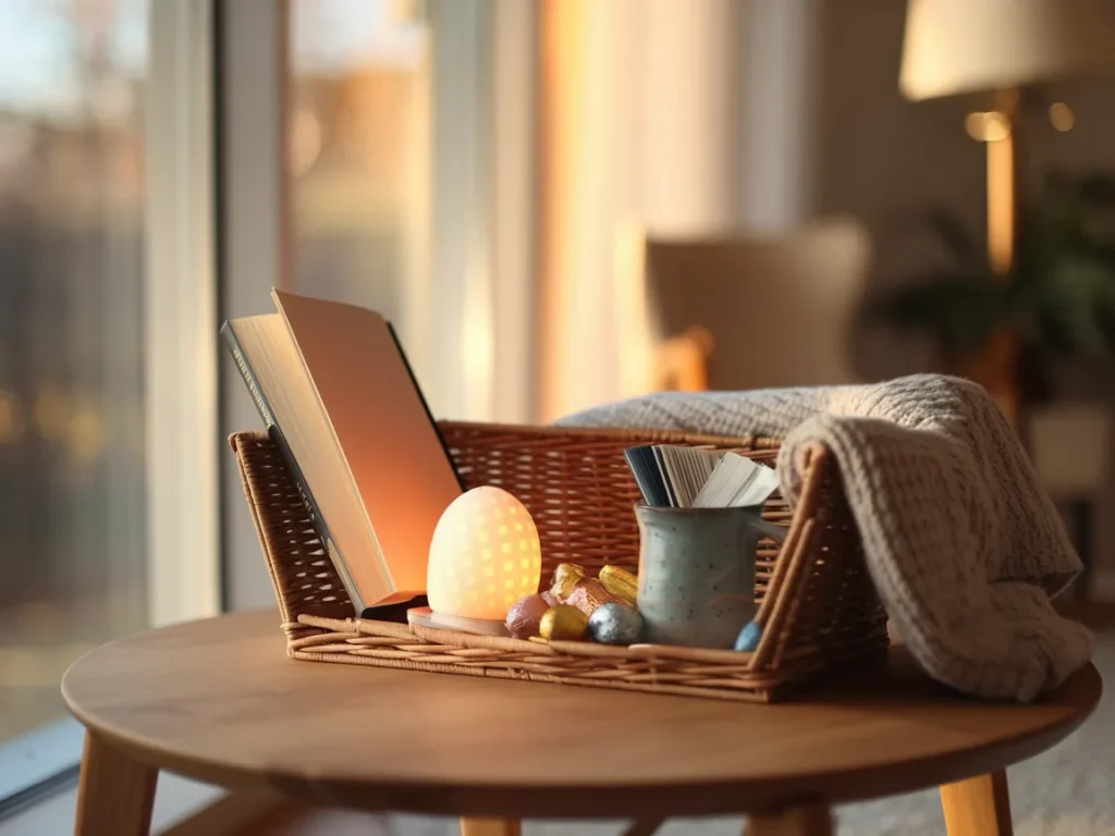 Place the book as the anchor piece in the back of the basket. In front of it, add a small reading light or a bookmark, a cozy blanket or scarf, a mug with tea bags or hot chocolate packets, and some Easter candy to snack on while reading. A pair of reading socks rounds it out nicely.