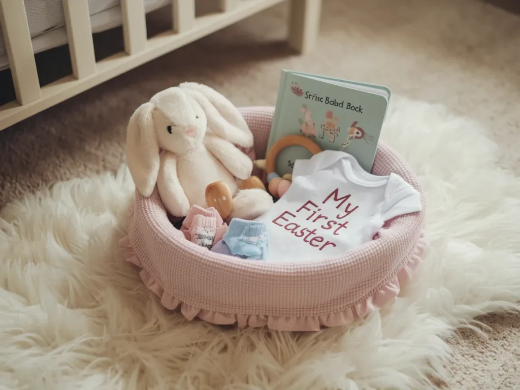 Use a soft fabric basket or a pastel-colored bucket. Inside, place a small plush bunny or lamb, a baby teether, a spring-themed board book (like “Pat the Bunny”), a pair of baby socks or booties, and a soft rattle. A onesie that says something like “My First Easter” adds the perfect photo-op element.