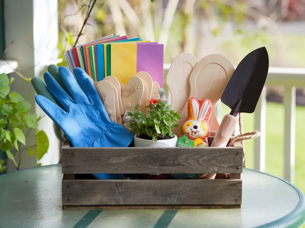 Use a terra cotta pot, a wooden crate, or even a gardening trug as the “basket.” Fill it with a pair of garden gloves, a few seed packets (herbs, wildflowers, or vegetables), a small hand trowel, plant markers, a seed-starting kit, and a bar of chocolate shaped like a bunny. You can also add a small potted plant like a succulent or a mini herb for instant impact.