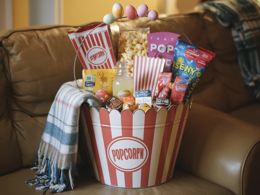 Use a large bowl, a popcorn bucket, or a reusable basket. Fill it with two bags of microwave popcorn, a box of movie theater candy (Milk Duds, Sour Patch Kids, or Reese’s Pieces), a small bottle of soda or a fancy lemonade, a streaming service gift card, and a cozy throw blanket. Add a few Easter chocolate eggs scattered on top to keep it seasonal.
