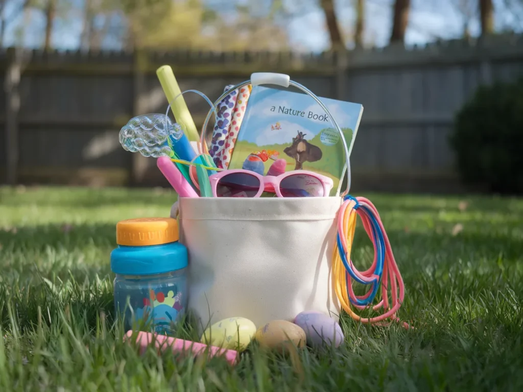 Use a small canvas tote or a bucket instead of a traditional basket, something the kid can carry on adventures. Fill it with a bubble wand set, a pack of sidewalk chalk, a jump rope, a pair of kid sunglasses, and a small water bottle. Add one nature-themed book and a few chocolate eggs to keep the Easter spirit alive.