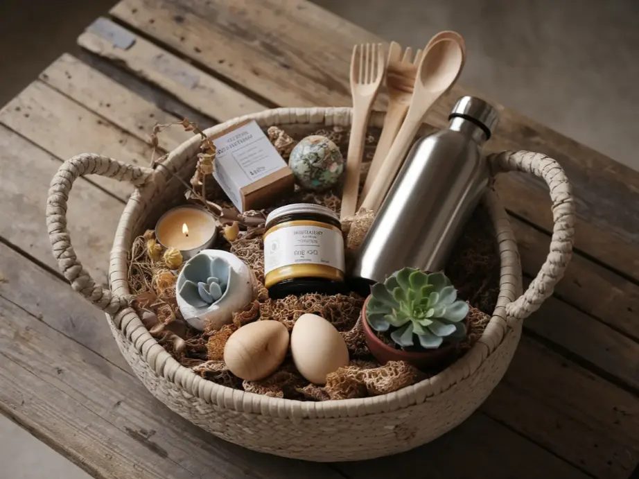 Start with the basket itself, choose one made from natural materials like seagrass, wicker, or recycled fabric. Replace plastic grass with shredded brown kraft paper or dried moss. Fill it with beeswax candles, seed bombs (balls of clay and seeds that grow wildflowers), a reusable water bottle, bamboo utensils, organic chocolate, and a small potted plant.