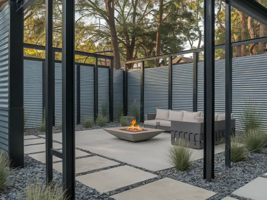 Corrugated steel panels framed by wood or metal posts create an industrial-modern look that stands out. You can leave the metal in its natural galvanized finish for a rustic vibe or paint it matte black for a sleek contemporary feel. This style works especially well in desert landscapes and urban backyards.