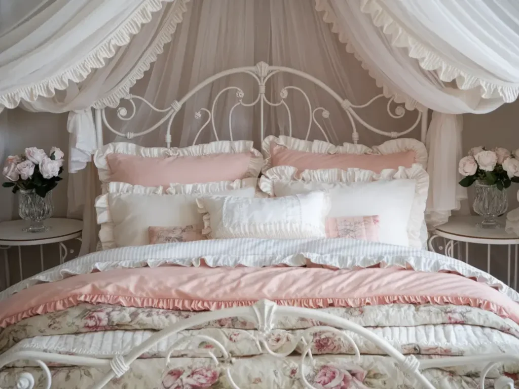 Metal bed frames bring old-world romance to bedrooms. Wrought iron in white or soft cream works best. Scrollwork and curves add feminine charm.