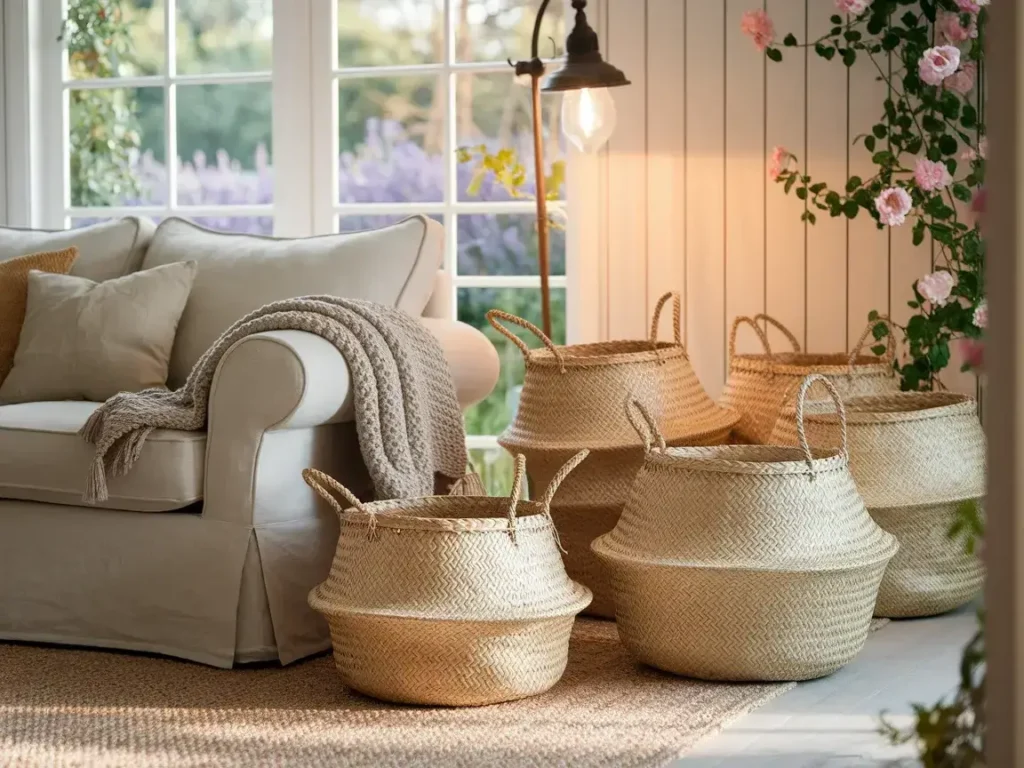 Woven baskets add farmhouse texture while hiding clutter. Baskets work well for blankets, toys, magazines, or pillows. They keep the room clean without adding heavy furniture.