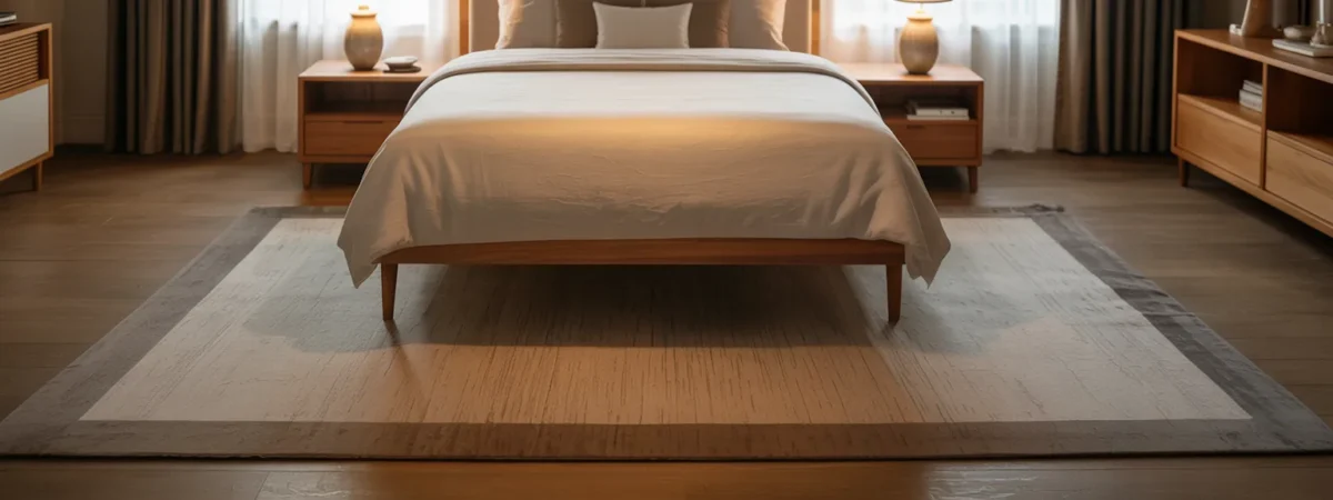 Proper area rug size anchors the bed and improves comfort underfoot. A rug should extend beyond both sides of the bed so feet land on a soft surface when standing up. Rugs that stop at the bed edge feel disconnected and reduce balance. In most bedrooms, the rug should extend at least 18 to 24 inches on each side. Larger rugs improve visual stability and warmth. Rugs also help reduce sound and echo, which supports calm rest.