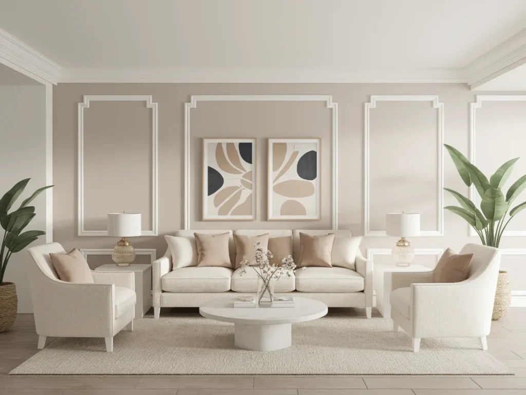 Use soft shades like warm gray, beige, or off-white. Keep decor light so the wall texture stands out. A panel accent wall makes the living room look more detailed without adding clutter.