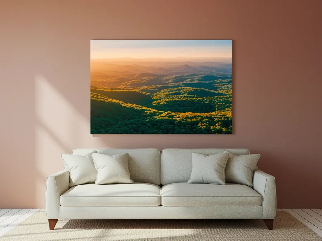 The artwork should avoid heavy detail. Broad areas of color read better from a distance. Placing landscape art at eye level helps the colors connect naturally with furniture and flooring.