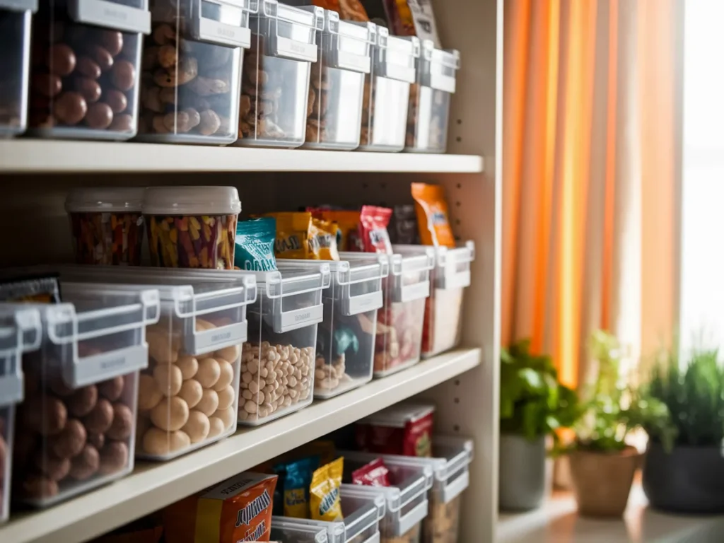 The snack zone should sit at an easy reach height. Clear bins help control portions and visibility. When snacks stay in one place, restocking and cleanup become easier.