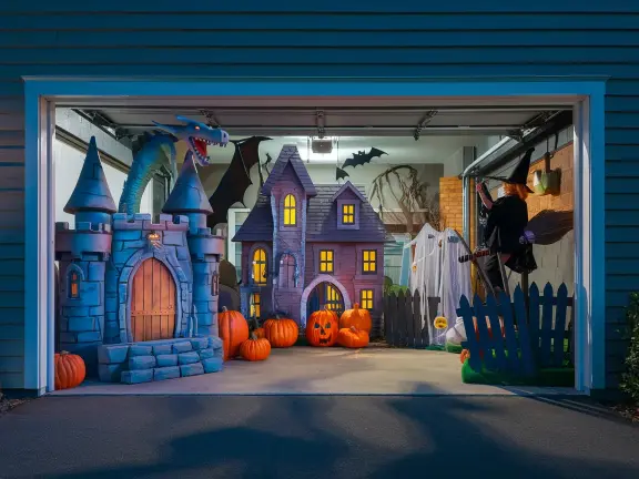Lighting and scale turn a garage into a Halloween scene by making large shapes visible from the street while hiding unnecessary detail. Garages work best for Halloween when decorations read clearly from a distance. Most viewers see the setup from the sidewalk or road. Small props disappear at night. Large backdrops, tall figures, and wide scenes stay visible. One main structure should fill the garage opening. This could be a backdrop, large figure, or themed wall. The garage door frame naturally acts as a stage border. Using that frame improves focus and prevents visual spread.