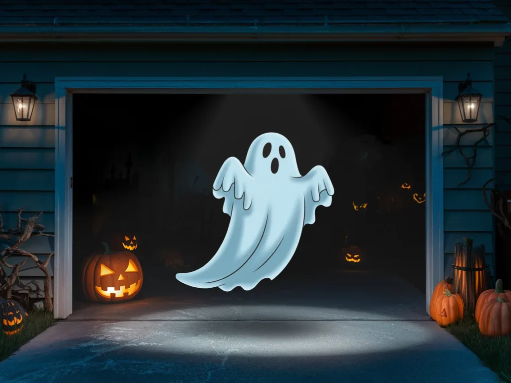 A hanging ghost ceiling scene uses vertical space instead of floor clutter. Lightweight fabric ghosts hang at different heights from the garage ceiling. Motion from air adds life. This setup stays safe when walk paths remain clear.