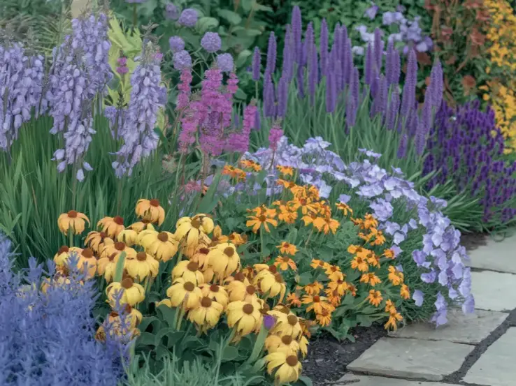 These seven plants together create a garden palette of violet-blue, lavender, magenta-pink, golden-yellow, red-orange, deep purple, and pale yellow. Those colors naturally complement each other and create a garden that looks rich, layered, and professionally designed.