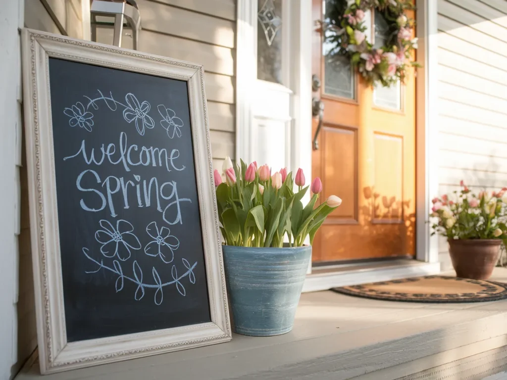 And don’t forget the porch. An outdoor chalkboard by the front door is one of the easiest ways to boost curb appeal for spring. Write “Welcome” or “Happy Spring” and add flower doodles. Cover it or bring it in during rain to keep it looking fresh.