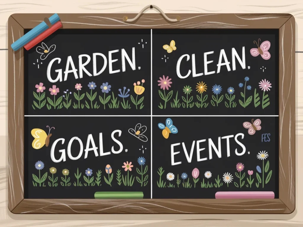 The key is to keep it visually balanced. Use a thick horizontal line to divide sections. Add small flower doodles or leaf accents between sections so it still feels like spring decor and not a boring office whiteboard. Use different chalk colors for different categories. Green for garden tasks. Pink for social events. White for daily goals.