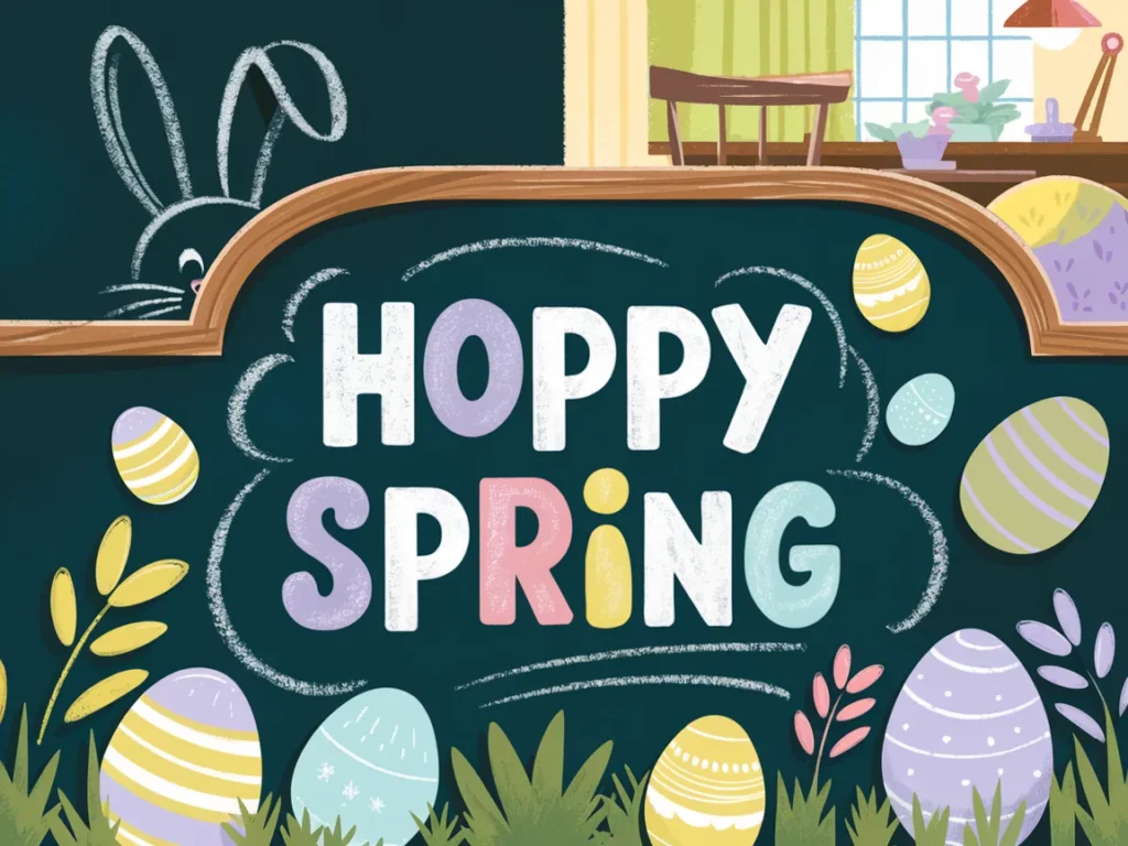 One idea that always steals the show is drawing a tiny bunny peeking out from the bottom corner of the board. Give it big floppy ears and a cotton-tail. Add a speech bubble that says “Happy Easter” or “Hoppy Spring.” It sounds silly, but that little character gives the whole board so much personality.